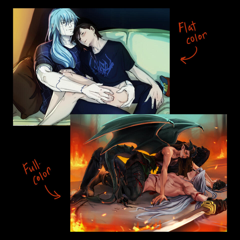 a maximum of 3 big modifications (change of pose, elements etc) at the sketch stage only. anything more than that will have an extra fee (more modifications means more time spent on the piece).